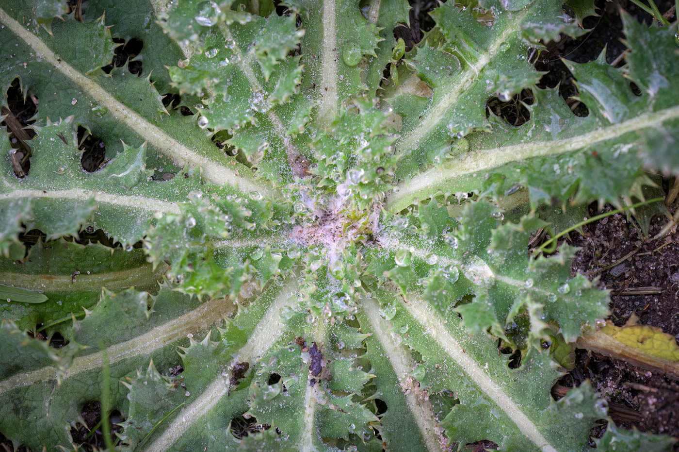 Gekroesde melkdistel, met nog een restantje sneeuw
